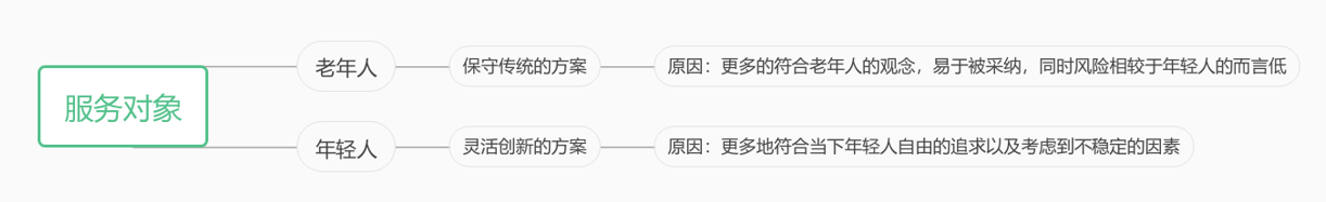 ① 根据服务对象的年龄,我们会选择符合年龄段的沟通方式,例如是老年人的话,我们会更多地倾向于给出保守传统的方案,以匹配服务对象的心理特点,而对于年轻人的话,我们会更多地根据年轻人自身的选择更加灵活创新的方案。